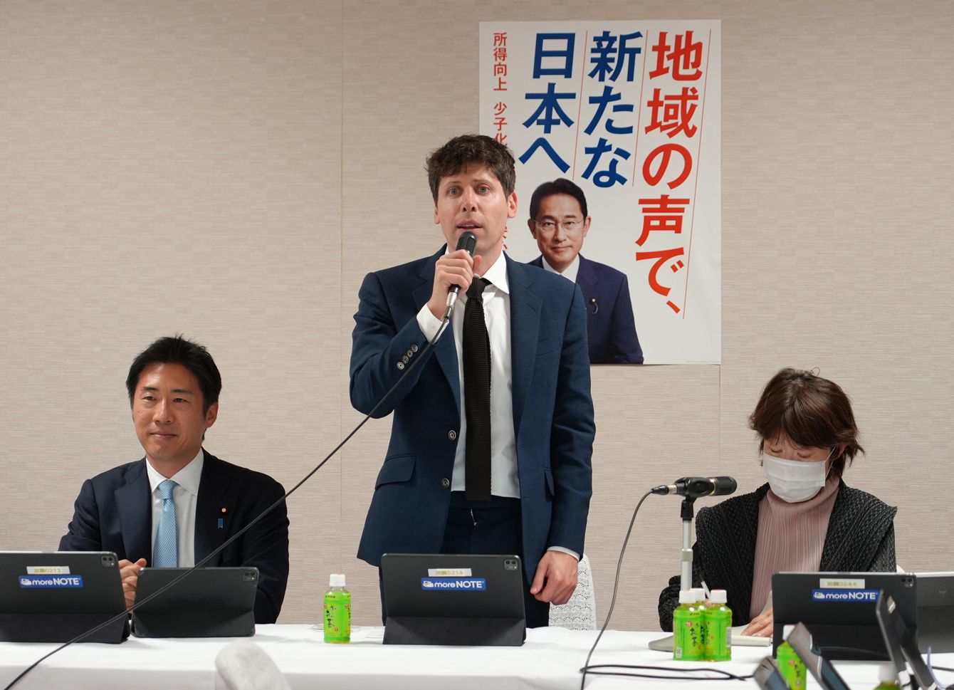 自民党デジタル社会推進本部のプロジェクトチームの会合に出席した対話型人工知能(AI)「チャットGPT」の開発企業オープンAIのサム・アルトマン最高経営責任者(CEO)(中央)=2023年4月10日午後、東京・永田町の同党本部