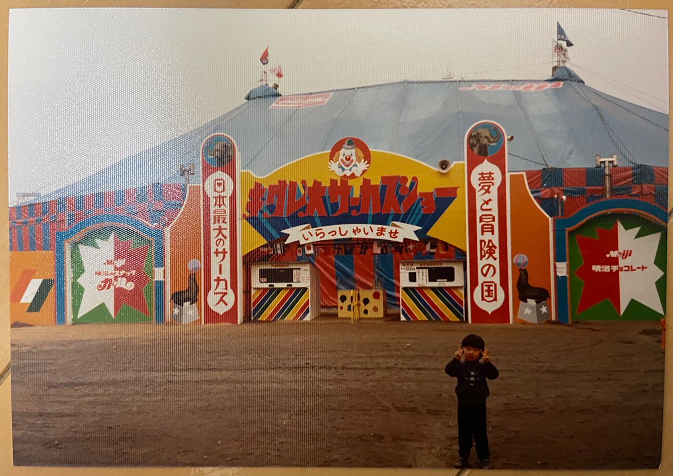 キグレサーカスの入り口でポーズをとる5歳頃の筆者。カンバンには「夢と冒険の国」「日本最大のサーカス」と書いてある。
