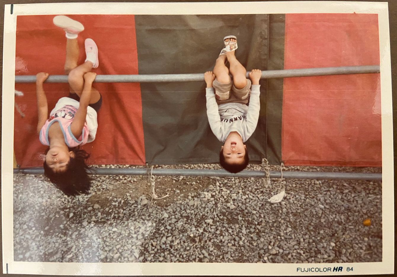 サーカスに設置された鉄パイプで遊ぶ5歳頃の筆者と友達。