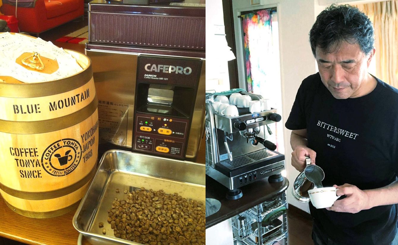 (写真左)山本さんご自慢の焙煎機、(写真右)ラテを作るのはお手の物