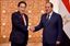 2023年4月30日、エジプト大統領府が発表した資料写真には、カイロでの会談を前に、日本の岸田文雄首相を迎えるアブデル・ファタフ・アル・シシ大統領(右)が写っています。
