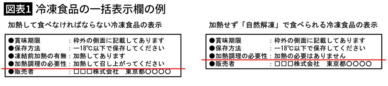 自然解凍で食べられる冷凍食品は大抵、表面に大きく「自然解凍OK」「自然解凍調理が可能です」「自然解凍でもおいしく召し上がれます」などと表示されている。裏面や側面の一括表示欄の「加熱調理の必要性」の項目を見ると、加熱せず自然解凍で食べられるかどうか判断できる