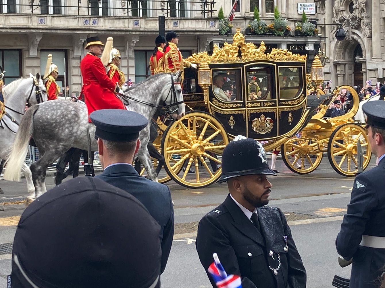 2023年5月6日、ロンドンで戴冠式へ向かうチャールズ英国王とカミラ王妃を乗せた馬車「ダイヤモンド・ジュビリー・ステート・コーチ」