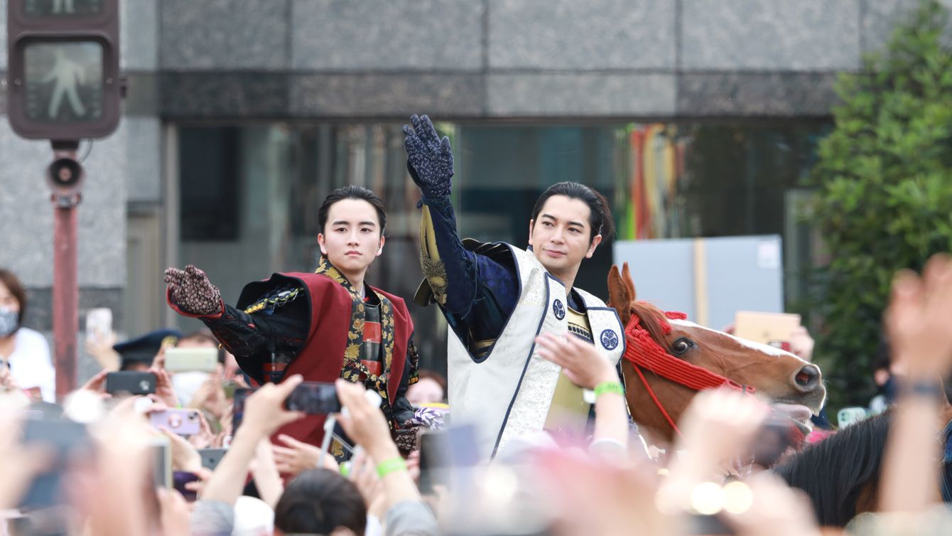 2023年5月5日、浜松まつりで行進する大河ドラマ「どうする家康」の家康役・松本潤(右)と井伊直政(万千代)役の板垣李光人(左)
