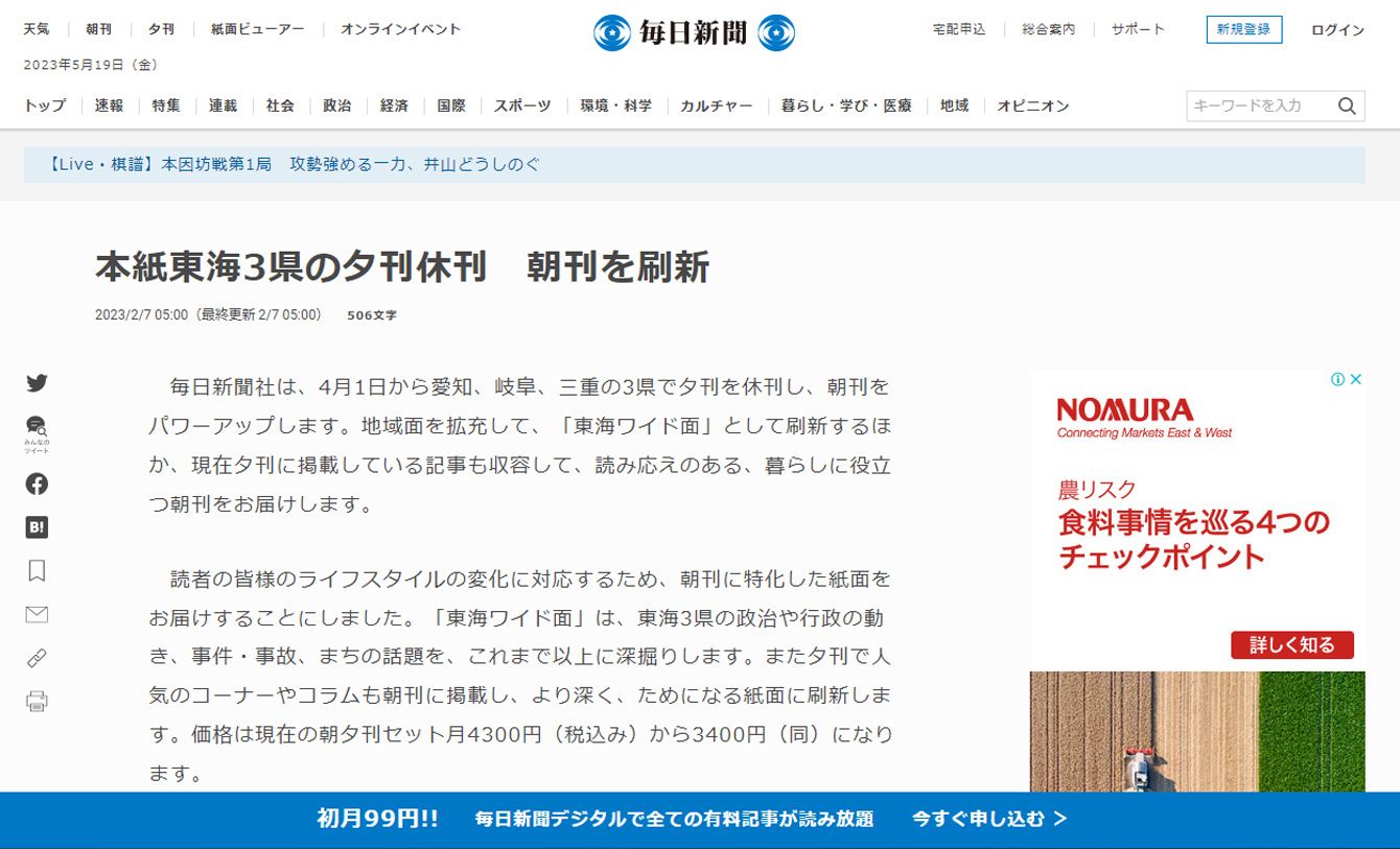 出典=毎日新聞「本紙東海3県の夕刊休刊 朝刊を刷新」2023年2月7日