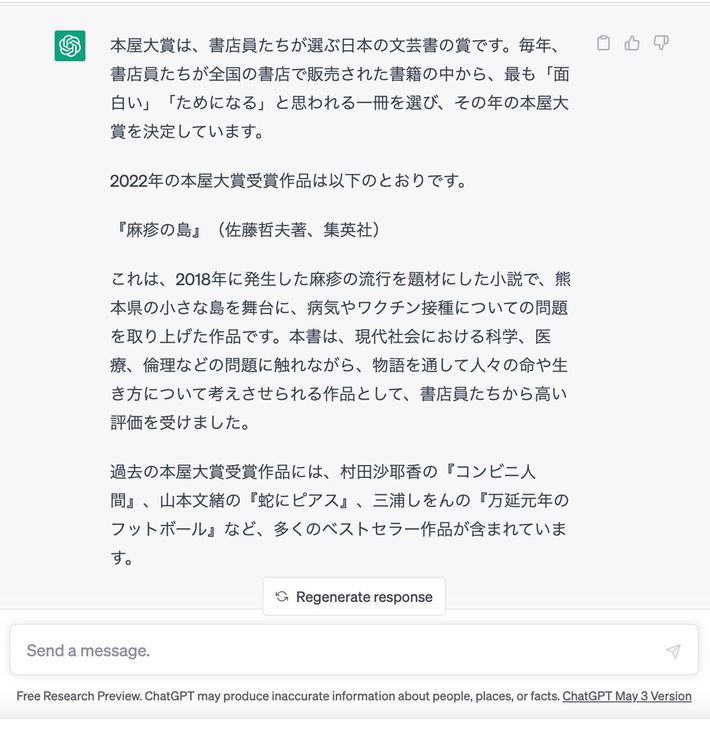 ChatGPTに「本屋大賞作品の一覧を述べて」と質問した結果