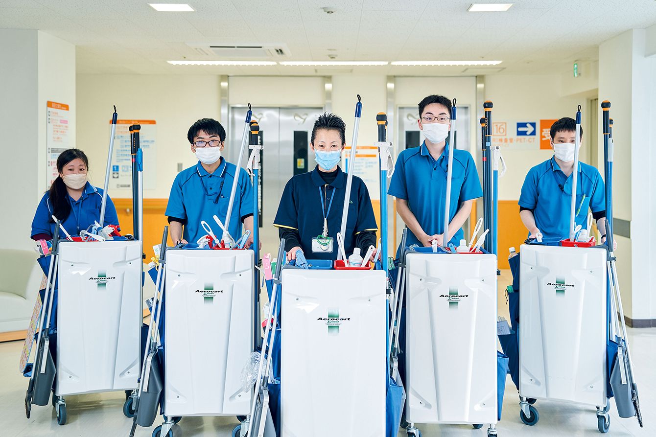 2020年からスタートした、鳥取県で障がい者雇用を積極的に行なっていた『さんびる』と障がい者就業生活支援センター『しゅーと』と『鳥取大学医学部附属病院』という3者での新しい取り組み。写真中央の清掃員・坂川ルミ子は、この枠組みで重要なポジションを担っているスタッフだ。
