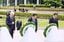 2023年5月19日、広島で開催されたG7首脳会議の一環として平和記念公園を訪問し、花輪を捧げた後、黙祷をする(左から右)ジョー・バイデン米国大統領、岸田文雄日本国首相、エマニュエル・マクロン仏大統領の様子が外務省により撮影・公開された。
