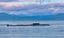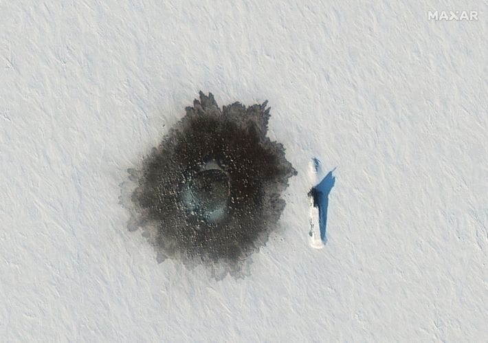 北極海の一部、バレンツ海に位置するロシア領アレクサンドラ島付近で、衛星写真にとらえられたデルタⅣ型弾道ミサイル搭載原子力潜水艦(黒い穴の右に見える縦長の艦体)