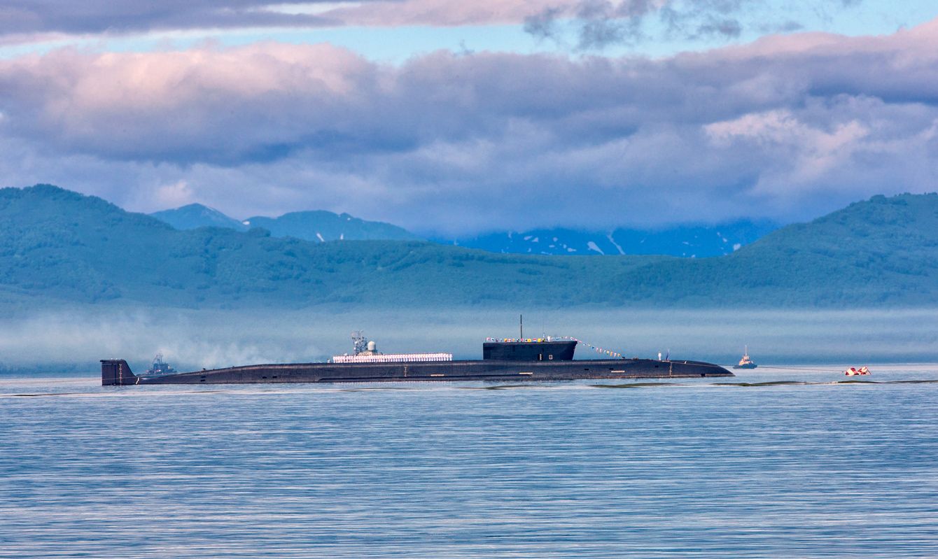 北極海の一部、バレンツ海に位置するロシア領アレクサンドラ島付近で、衛星写真にとらえられたデルタⅣ型弾道ミサイル搭載原子力潜水艦(黒い穴の右に見える縦長の艦体)