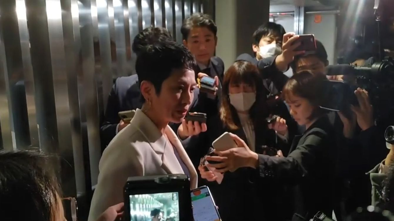 5月10日に立憲民主党本部で開かれた両院議員総会後に党本部前で報道陣の取材に答える蓮舫氏