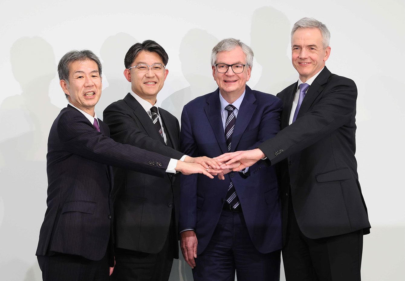 経営統合に関する記者会見後、笑顔で写真に納まる(左から)日野自動車の小木曽聡社長、トヨタ自動車の佐藤恒治社長、ダイムラートラックのマーティン・ダウム最高経営責任者(CEO)、三菱ふそうトラック・バスのカール・デッペン社長=2023年5月30日、東京都港区