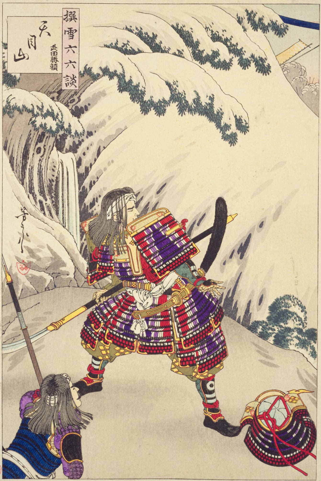 芳宗「撰雪六六談 天目山 武田勝頼」,秋山武右衛門,明治26.