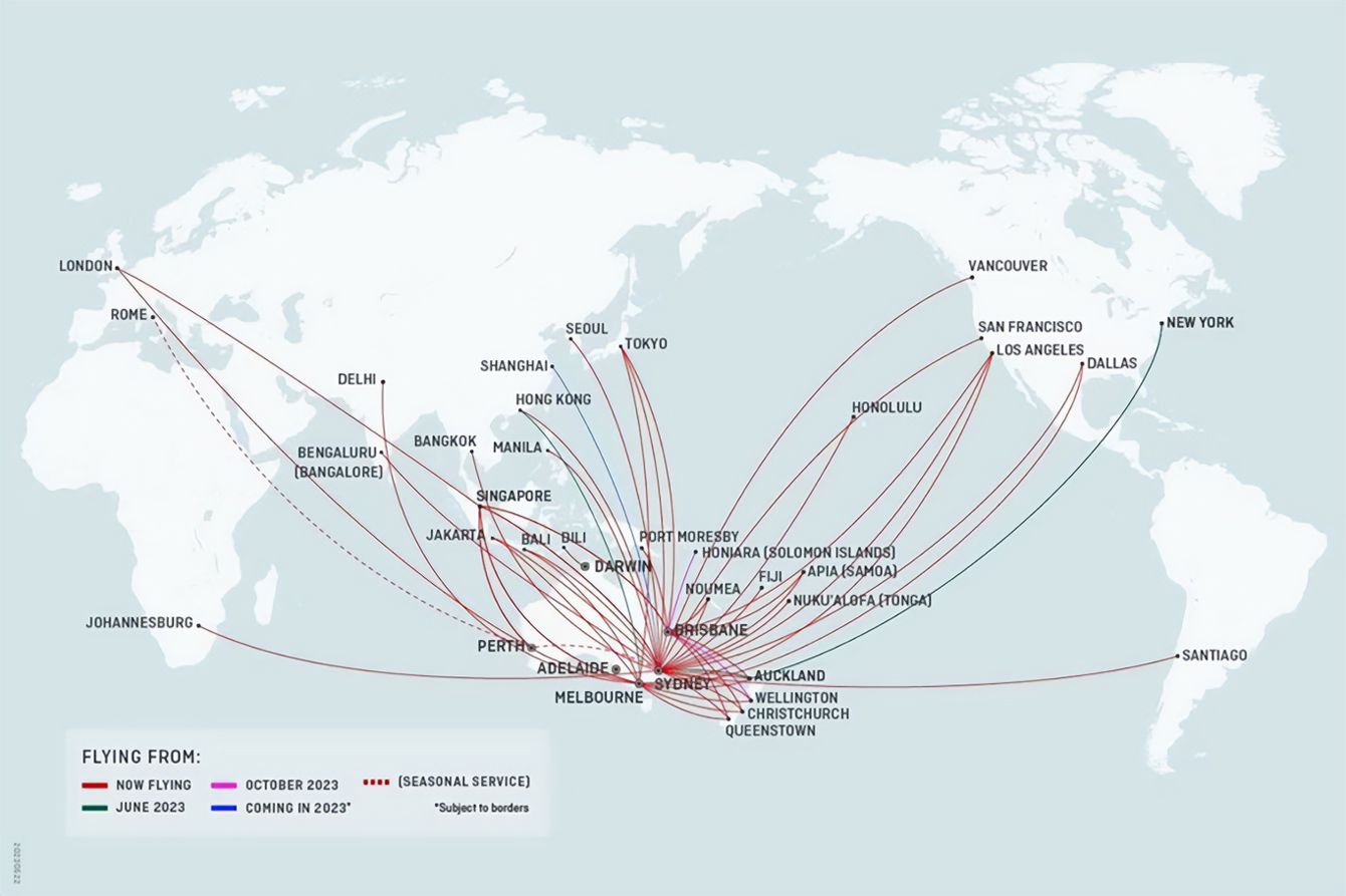 カンタス航空の航空路線。基本的にどの国行くにも長距離移動になる。南半球の国の宿命だ。(出典=