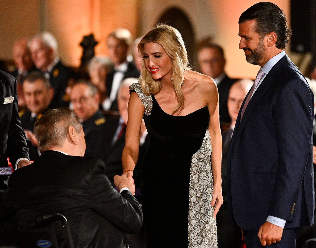 チェコスロバキアの独立記念日にプラハ城で行われた国家勲章とメダルの授与式で、母であるチェコ系アメリカ人の実業家イヴァナ・トランプの記念メダルを受け取るイヴァンカ・トランプ(中央)=2022年10月28日