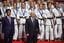 2019年9月5日、極東ロシアの港ウラジオストクで開催された東方経済フォーラムの傍らで行われた国際柔道トーナメント後、選手たちとポーズを取るロシアのウラジーミル・プーチン大統領(右)と日本の安倍晋三首相(左)。