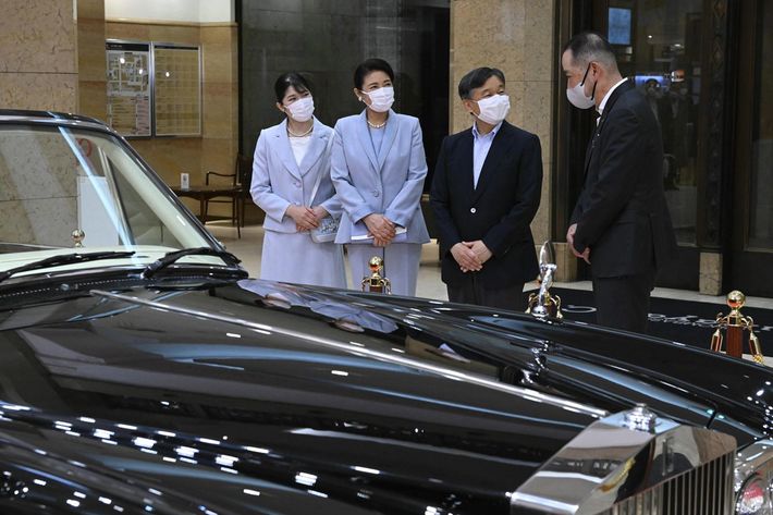 即位5年・成婚30年記念特別展「新しい時代とともに 天皇皇后両陛下の歩み」を訪れ、1993年の結婚パレードで使われたオープンカーを見られる天皇、皇后両陛下と長女愛子さま=2023年5月30日、東京都中央区の日本橋高島屋[代表撮影]