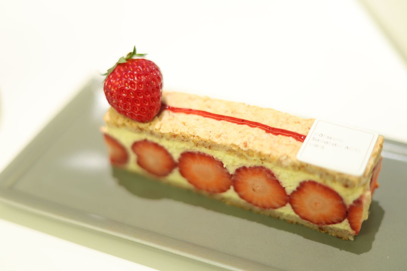 『パティスリー・サダハル・アオキ・パリ』のケーキ、「フレジエ」(930円 税抜価格。期間限定商品のため現在は発売していない)。ケーキのイメージを変えるスタイリッシュな四角いスイーツだ。