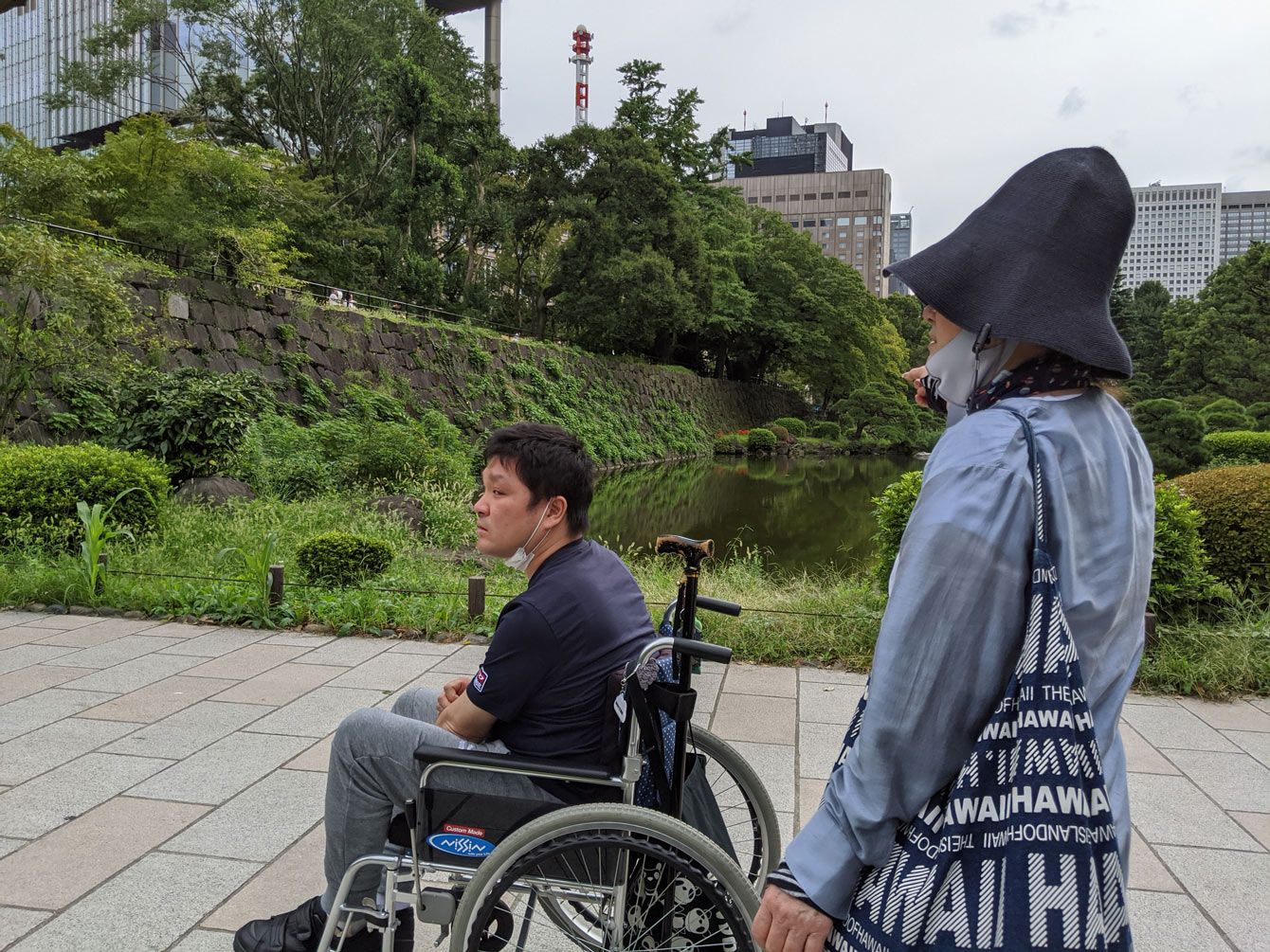 車椅子で移動する山本一真さん。母せつみさんの介助が欠かせない。