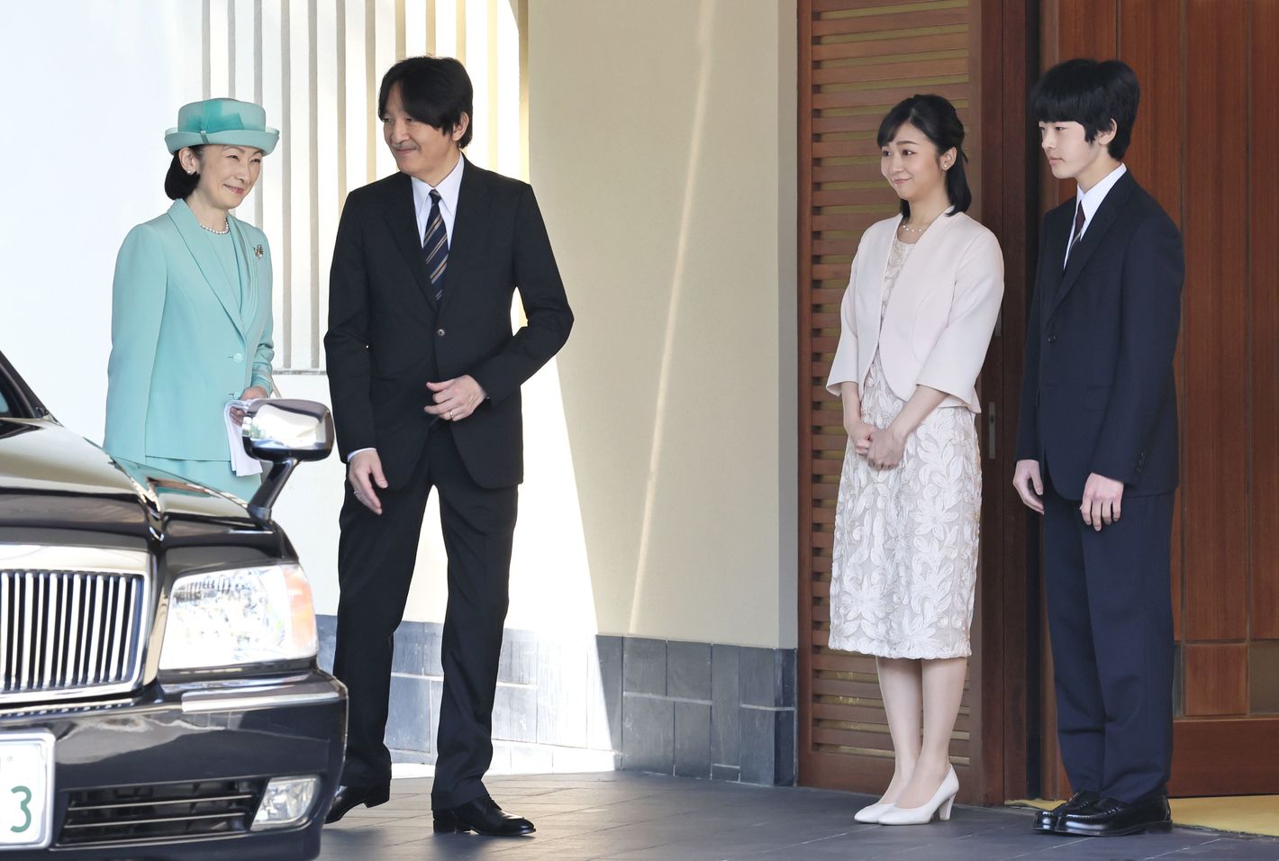 次女佳子さまと長男悠仁さまの見送りを受け、英国へ出発される秋篠宮ご夫妻=2023年5月4日午前、東京都港区[代表撮影]