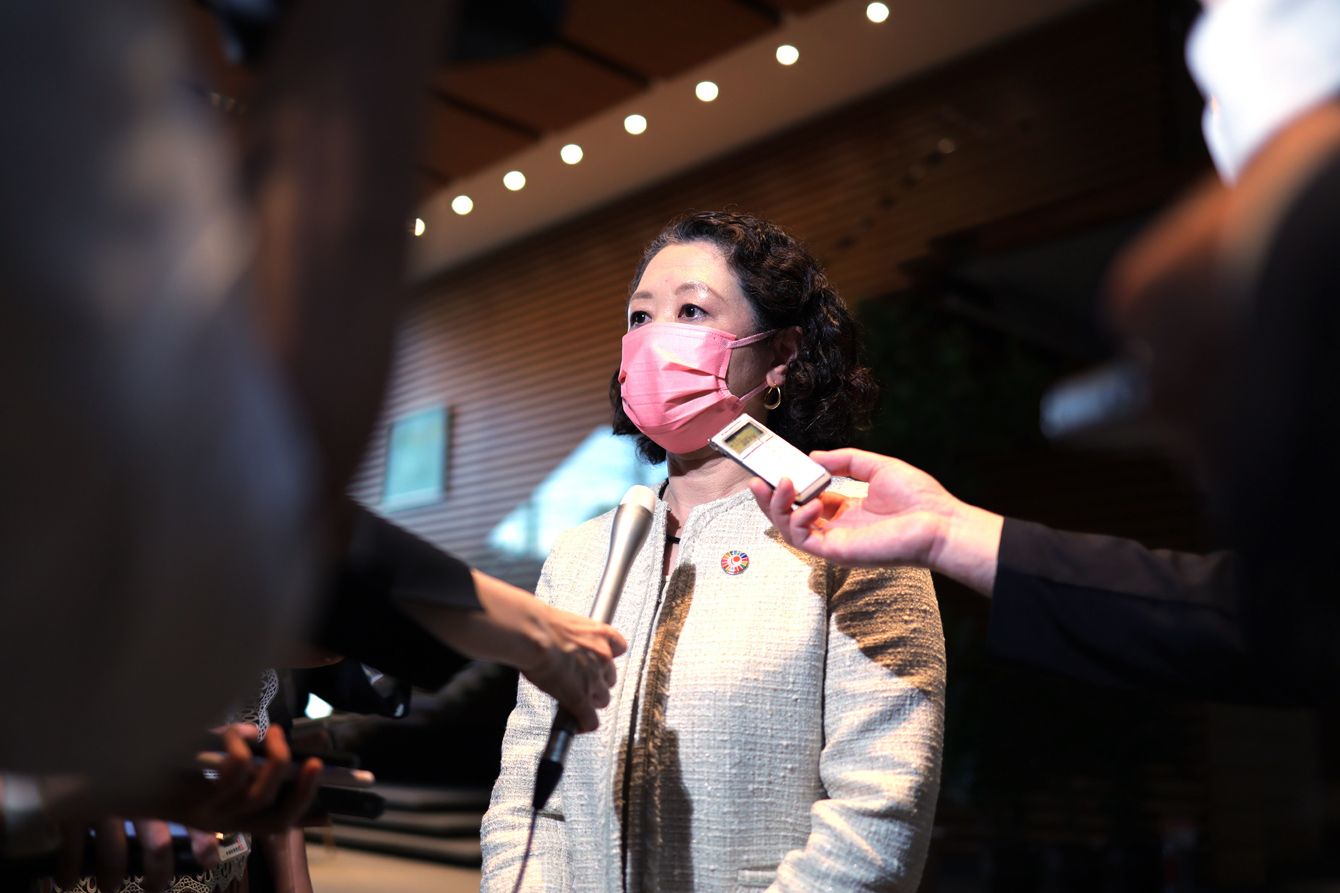 こども未来戦略会議を終え、報道陣の取材に応じる連合の芳野友子会長=2023年6月1日、首相官邸