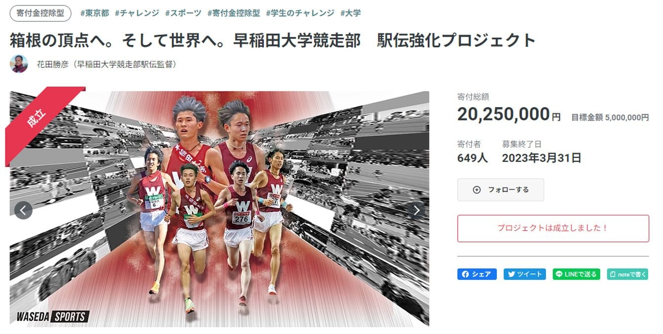 出所=READYFOR「箱根の頂点へ。そして世界へ。早稲田大学競走部 駅伝強化プロジェクト」