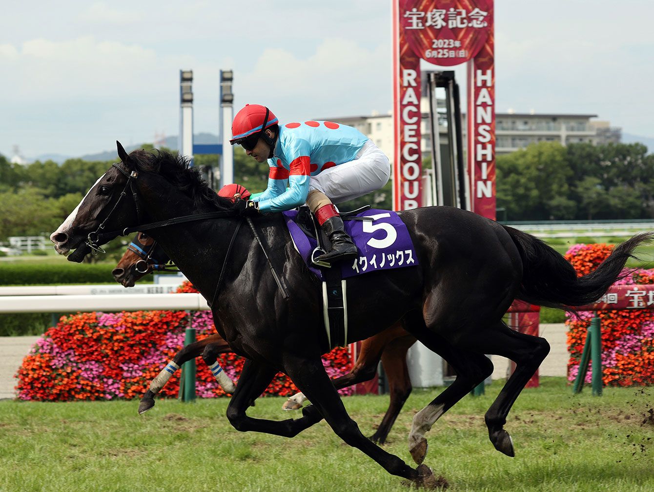第64回宝塚記念(GI)を制したクリストフ・ルメール騎乗のイクイノックス=2023年6月25日、兵庫・阪神競馬場