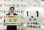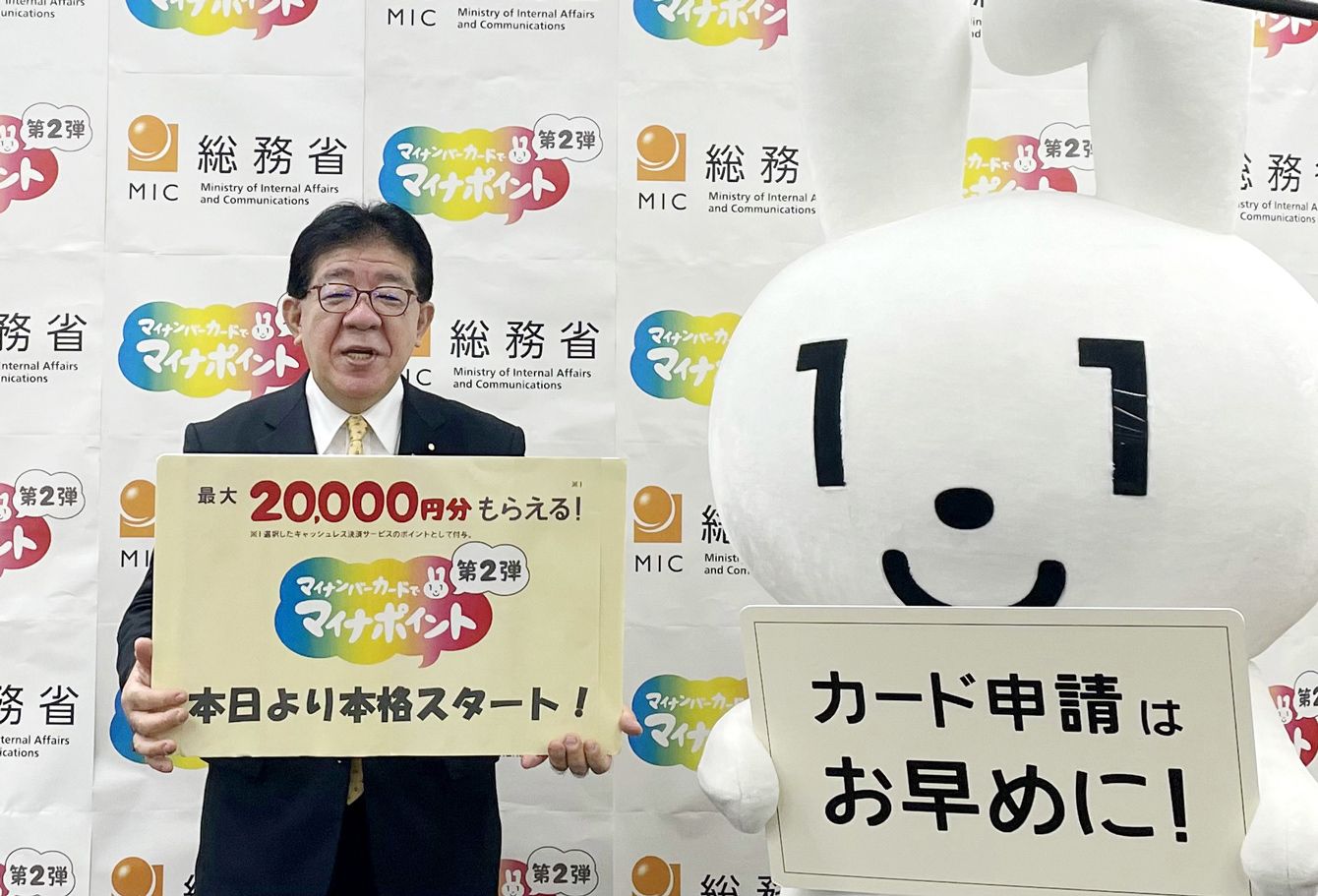 「マイナポイント」第2弾をPRする金子恭之総務相(左)と広報キャラクター「マイナちゃん」=2022年6月30日、東京・霞が関の同省