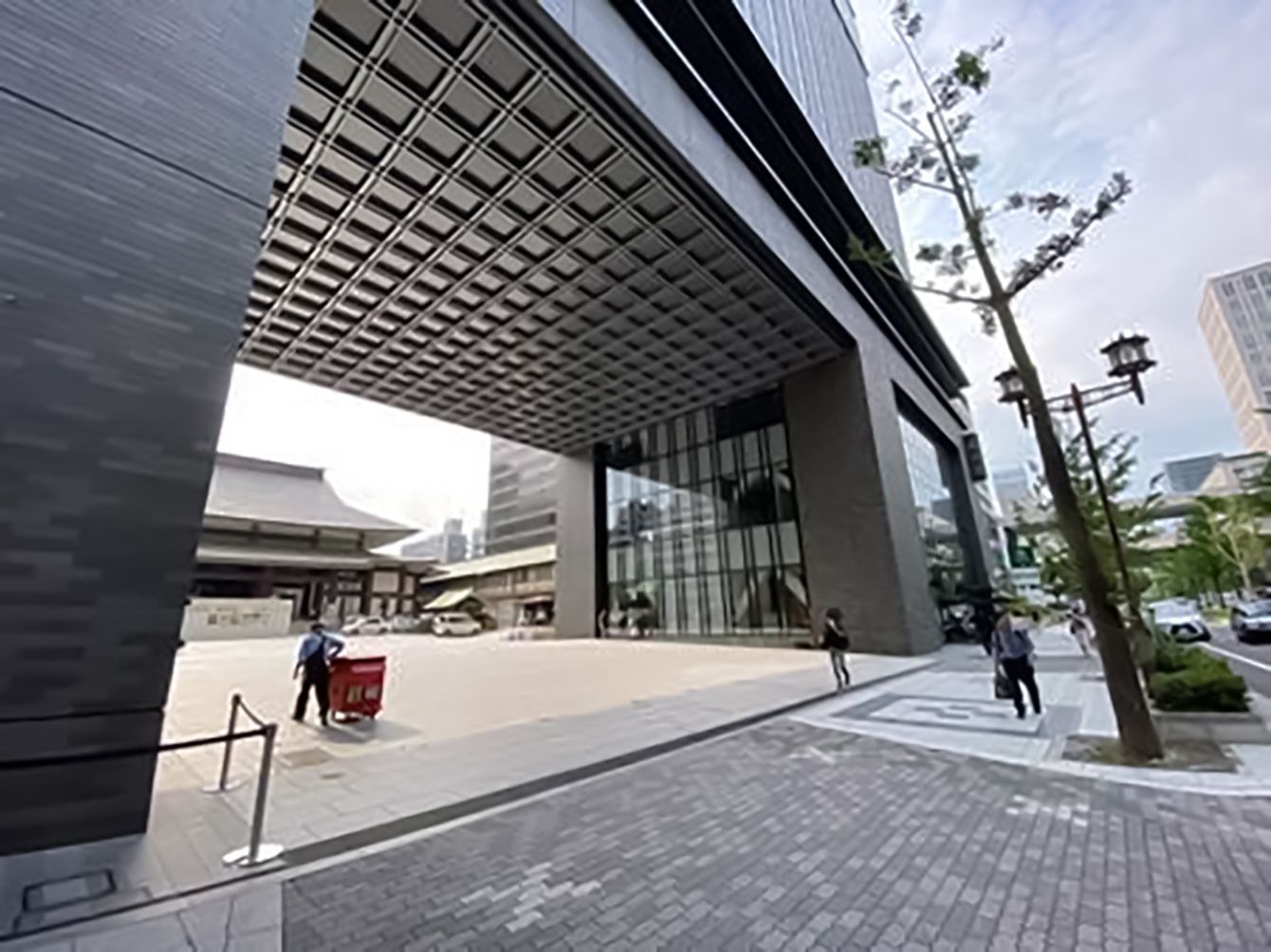 御堂筋を挟んで、山門とホテルが一体になった南御堂がみえる