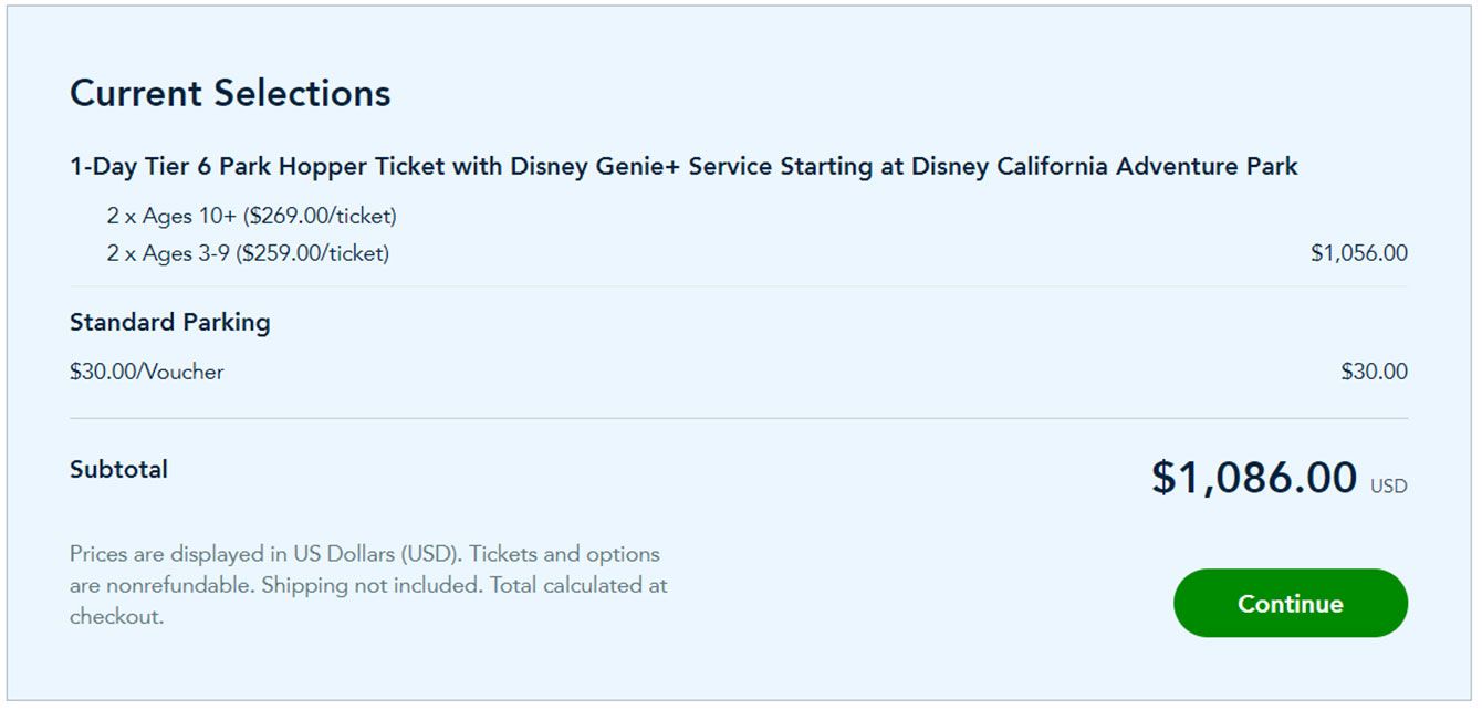 より。大人2人・子供2人で、パークホッパー、ディズニー・ジーニープラス・サービス、駐車場代を含めた合計額。