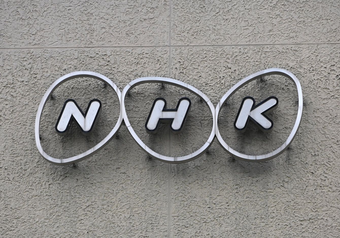 日本放送協会(NHK)放送センターに掲げられたロゴマーク=2023年6月7日、東京都渋谷区