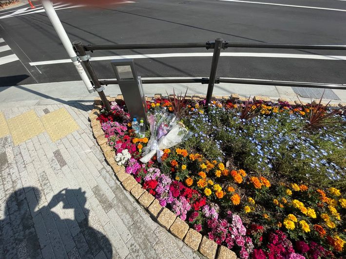 銃撃現場には手向け花が置かれていた