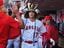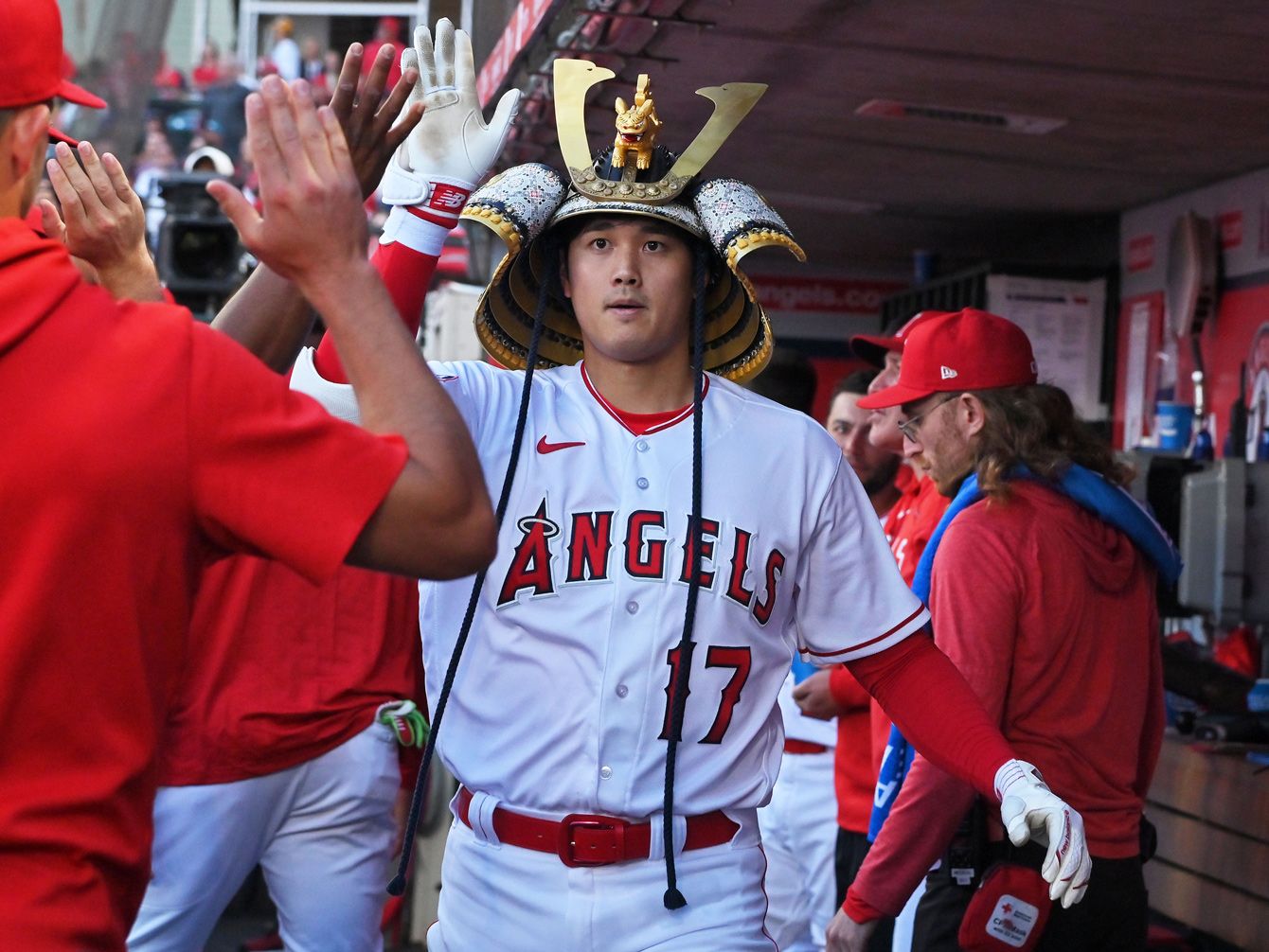 ホワイトソックス戦の4回、同点ソロ本塁打を放ちベンチで迎えられるエンゼルスの大谷翔平=2023年6月27日、アメリカ・アナハイム