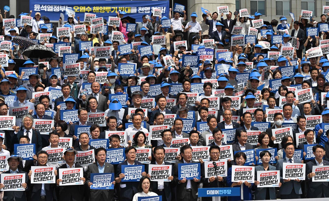 日本の福島原発処理水放出計画に反対する集会で、「福島汚染水の海洋投棄に反対する」と書かれたプラカードを掲げる韓国の主要野党「共に民主党」の議員ら=2023年7月7日、韓国・ソウル