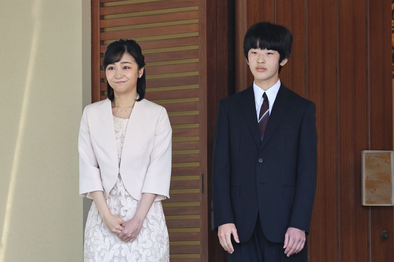 英国へ出発する秋篠宮ご夫妻を見送られる次女佳子さまと長男悠仁さま=2023年5月4日、東京都港区[代表撮影]