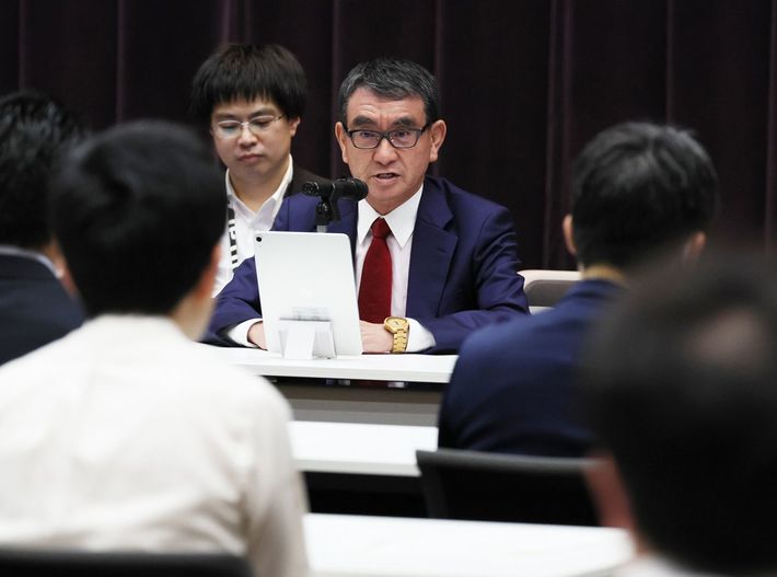 マイナンバー情報総点検に関する関係府省担当課室長説明会であいさつする河野太郎デジタル相(中央)=2023年6月30日午後、東京都千代田区