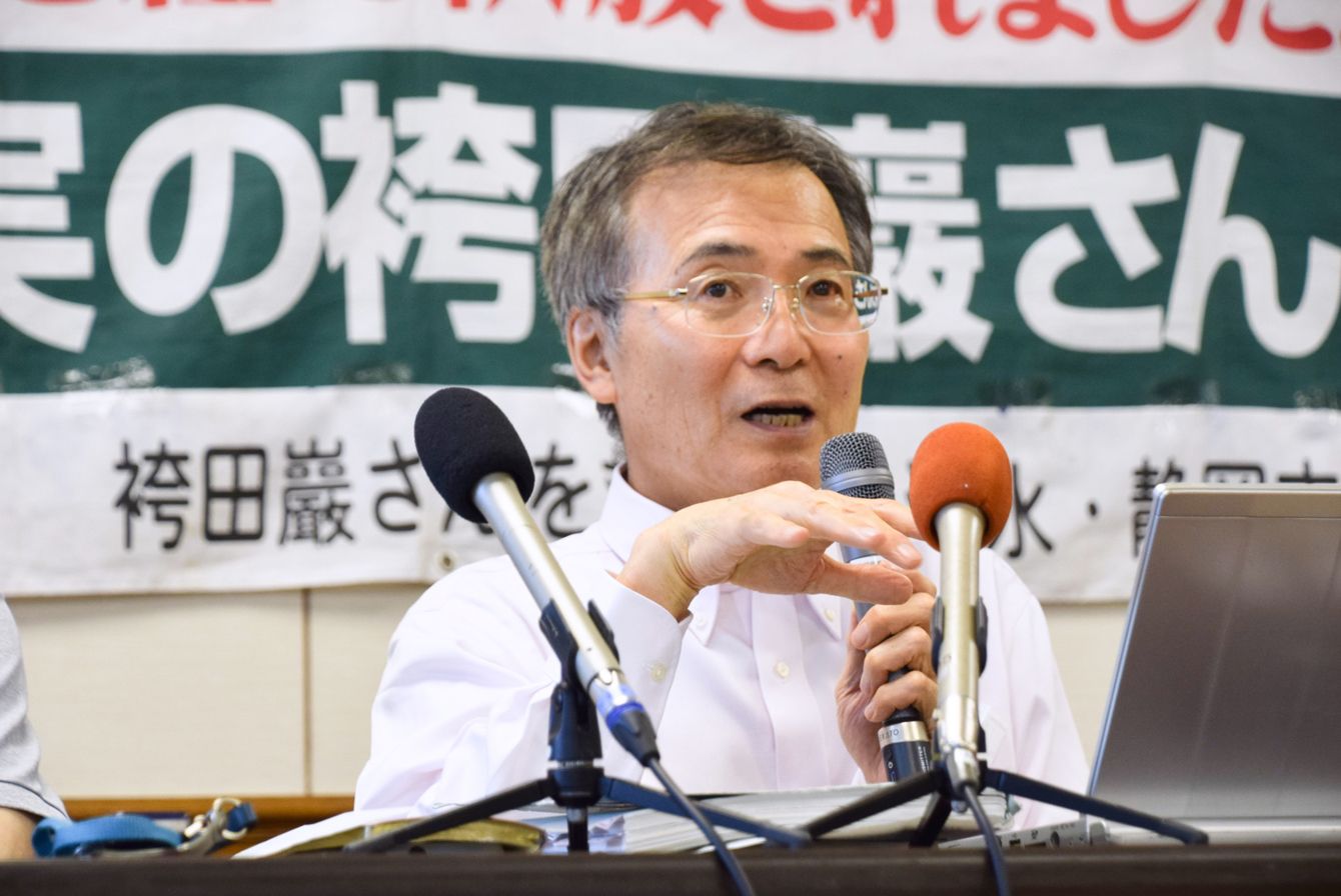 1966年に静岡県で一家4人が殺害された「袴田事件」の再審公判に向けた3者協議を終え、記者会見する弁護団の小川秀世事務局長=2023年7月19日、静岡市葵区