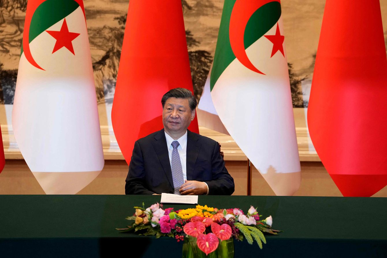 2023年7月18日、北京の人民大会堂でアルジェリアのアブデルマジド・テブン大統領との調印式に臨む中国の習近平国家主席