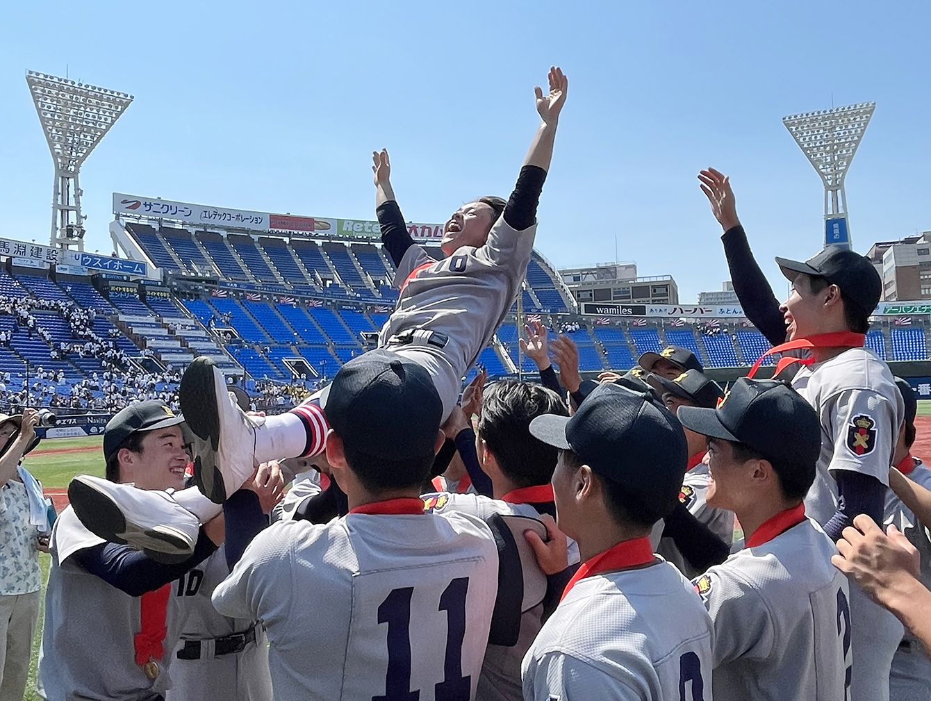 神奈川県大会を制し夏の甲子園出場を決めた慶応ナインら=2023年7月26日、横浜市