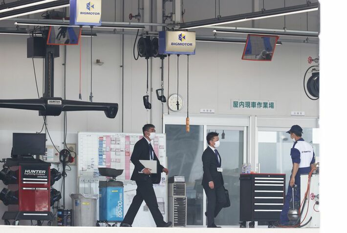 ビッグモーターの店舗で立ち入り検査をする国土交通省の職員=2023年7月28日午前、さいたま市緑区