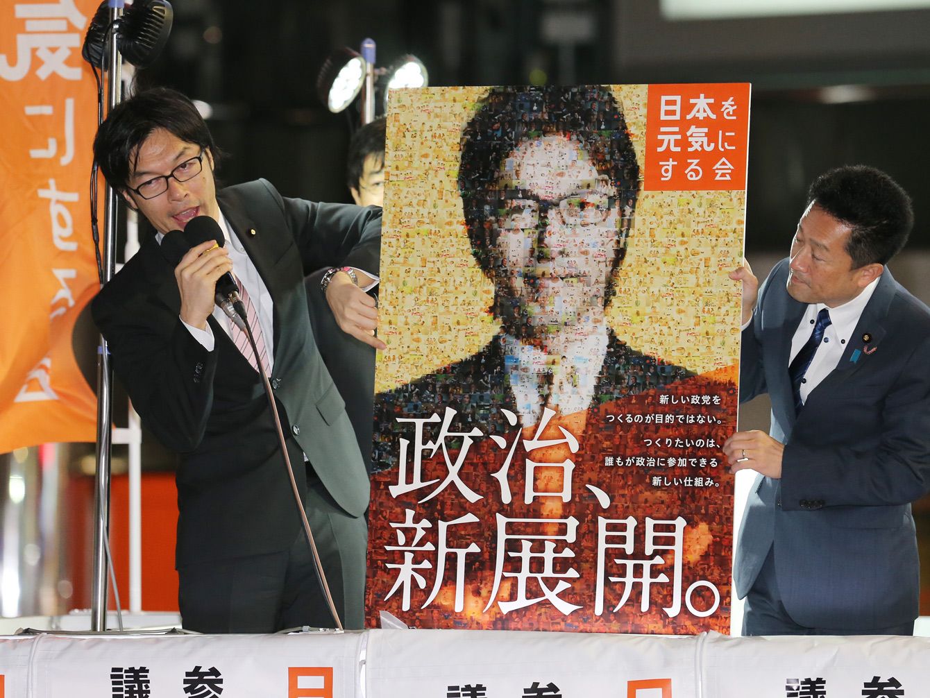 「日本を元気にする会」の屋外党大会で、イメージポスターを発表する松田公太代表(左)=2015年3月17日、東京都新宿区のJR新宿駅東口前
