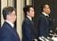 記者会見の終了前、起立して話す中古車販売大手ビッグモーターの兼重宏行社長(中央)ら=2023年7月25日午後、東京都港区