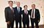 3社連合の提携関係見直しについて共同記者会見した(左から)日産自動車の内田誠社長、仏ルノーのジャンドミニク・スナール会長、三菱自動車の加藤隆雄社長、ルノーのルカ・デメオ最高経営責任者(CEO)=2023年2月6日、イギリス・ロンドン