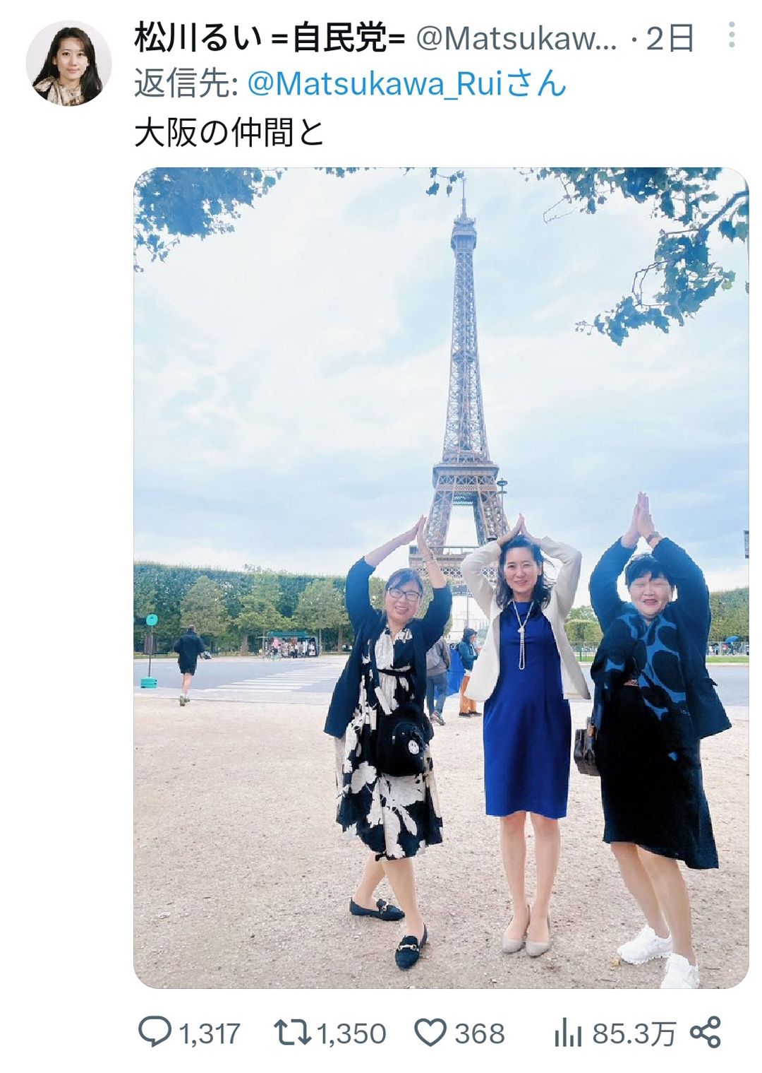 自民党の松川るい女性局長のフランスへの海外研修に関する投稿[松川氏のSNSより]