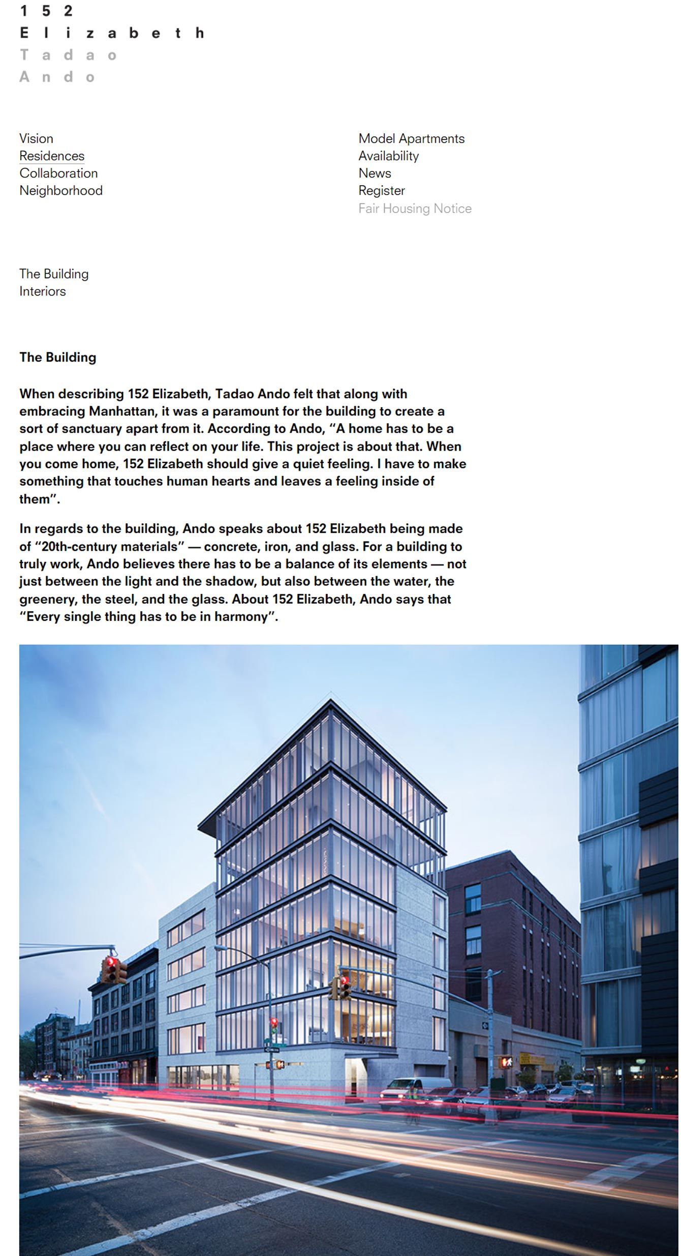 ニューヨーク市中心街にある「152 エリザベス」のウェブページ(