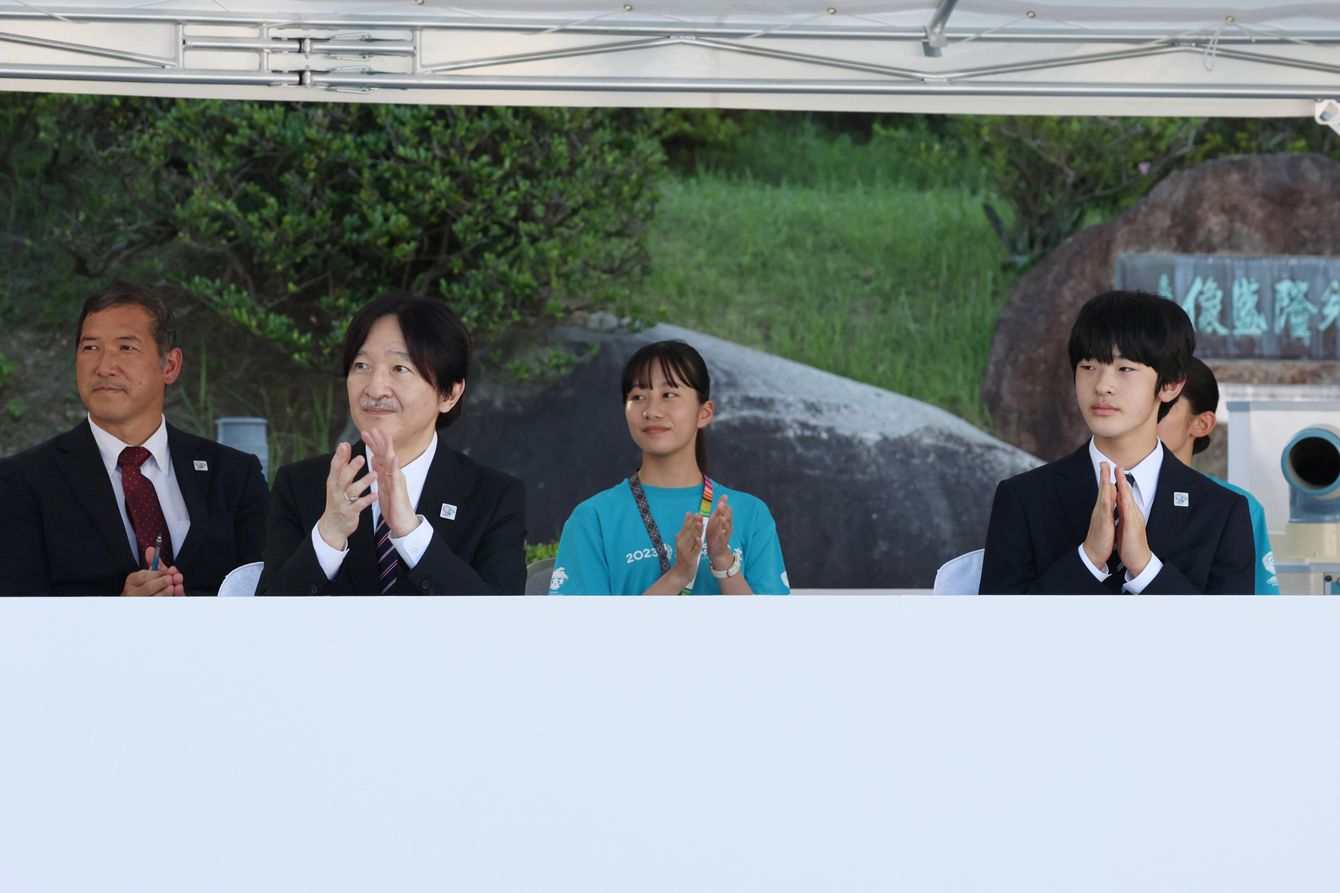 第47回全国高校総合文化祭「2023かごしま総文」のパレードを観覧される秋篠宮さまと長男悠仁さま=2023年7月29日、鹿児島市