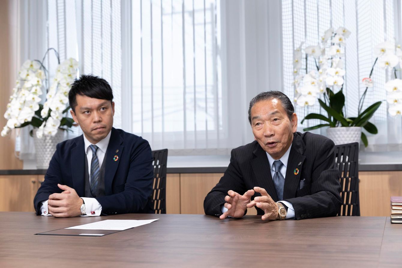 ひたちなかのトップディーラーである磯﨑自動車工業の磯﨑拓紀社長(左)と磯﨑孝会長