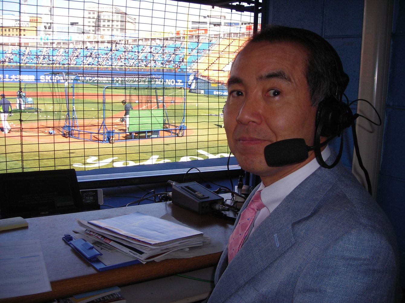 スポーツアナウンサーの四家秀治さん。2016年、横浜スタジアムの実況席で。