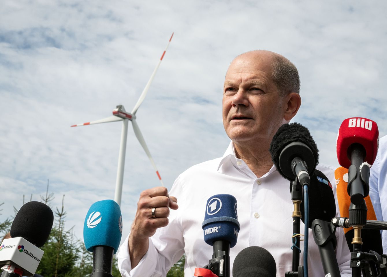 2023年8月22日、ノルトライン=ヴェストファーレン、シンメラートにある風力発電所の視察中、記者団に語るドイツのオラフ・ショルツ首相(SPD)