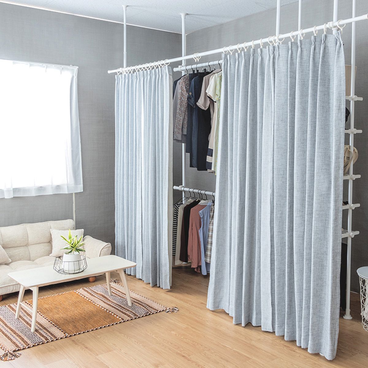 突っ張り棒式のカーテンで、部屋を仕切ることができる。